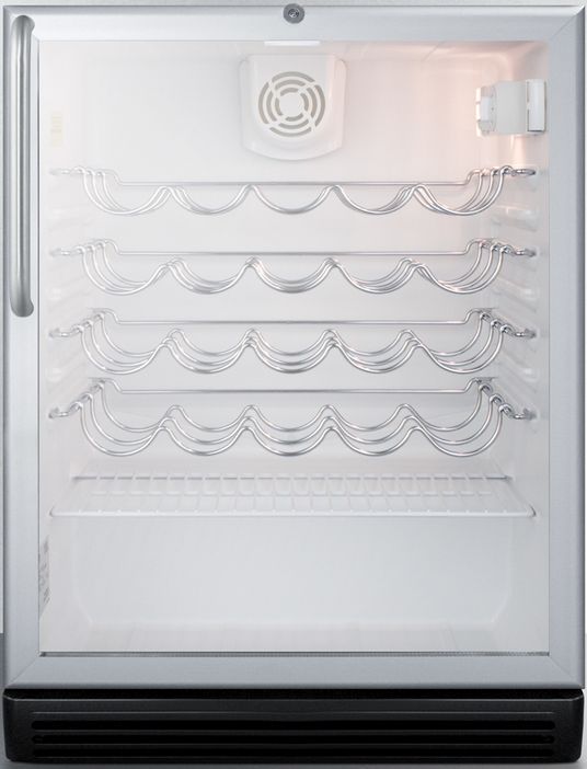 SUMMIT SWC6GBIADA series features European designed, commercially approved wine cellars capable of built-in use under lower ADA compliant counters. The SWC6GBLCSSADA is conveniently sized at just 24" wide, with a front-breathing design for built-in installation under counters. The fully finished stainless steel wrapped cabinet also allows freestanding use. This unit features a double pane tempered glass door for reliable storage. We include our signature towel bar style handle in brushed stainless steel to complete the professional look. The lock is located towards the top of the door for easier access. Inside, the SWC6GBLCSSADA includes adjustable scalloped shelves perfectly designed to hold bottles in place. The white interior helps to improve visibility, letting your collection stand out clearly. This unit includes an interior light with an on/off rocker switch located behind the adjustable dial thermostat. The SWC6GBLCSSADA is made in Europe and is ETL-S listed to NSF-7 standards for commercial use. Additional handle styles and door tint options are available. NOTE: These models are designed primarily for white wine storage but can be upgraded with a digital thermostat to accommodate red wine temperatures.
