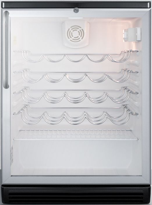 SUMMIT SWC6GBI series features ETL-S listed European wine cellars designed for commercial use. The SWC6GBLTB is conveniently sized at just 24" wide and deep. It comes with a fully finished black cabinet for freestanding use. The double pane tempered glass door offers a full view with added protection. We include our signature full-length towel bar style handle in brushed stainless steel to complete the professional look. The lock is located towards the top of the door for easier access. Inside, the SWC6GBLTB includes adjustable scalloped shelves perfectly designed to hold bottles in place. The white interior helps to improve visibility, letting your collection stand out clearly. This unit includes an interior light with an on/off rocker switch located behind the adjustable dial thermostat. The SWC6GBLTB is made in Europe and is ETL-S listed to NSF-7 standards for commercial use. Additional handle styles and door tint options are available. NOTE: These models are designed primarily for white wine storage but can be upgraded with a digital thermostat to accommodate red wine temperatures.