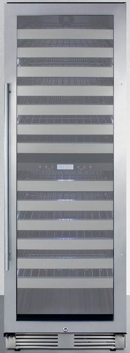 Summit offers a unique selection of built-in capable full-sized wine cellars with a versatile luxury design ideal for residential or commercial use. The SWCP2163 is a 24" wide dual zone wine cellar that is ETL-S listed to NSF-7 commercial standards. The upper zone is reserved for white and sparkling wine, while the lower zone features a warmer temperature range to best preserve reds. It features a front-breathing design for built-in installation, with a fully finished black cabinet that also allows freestanding use. Sized just under 27" deep, this unit has a sealed back and right angle plug for added depth savings. The luxury exterior features a user-reversible double pane tempered glass door with a seamless stainless steel trim. A stainless steel kickplate provides added elegance, while the pro-style handle completes the look. This unit includes a factory-installed keyed lock for added security and powerful magnetic gaskets to ensure a proper seal in high-traffic commercial settings.Read More