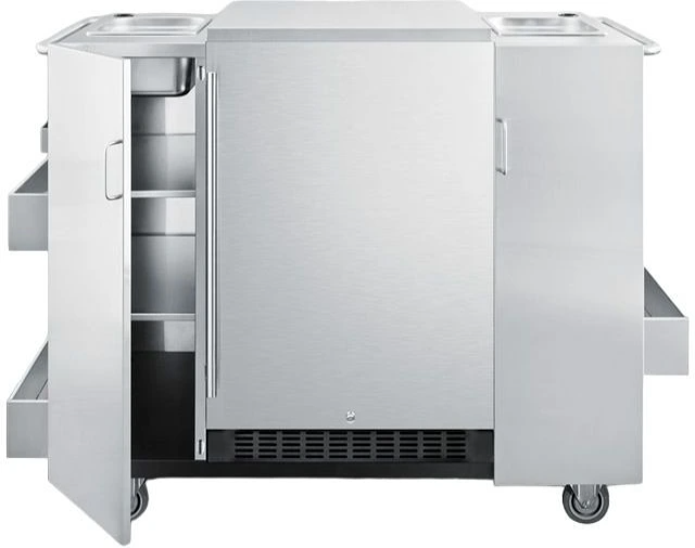 SUMMIT's CartOSRF brings luxury and convenience to the outdoors in a stainless steel serving cart with our leading outdoor refrigerator. This 61" wide unit lets you create an upscale kitchen right in your own backyard, beginning with ample storage space. Keep items on three exterior shelves and inside magnetic locking doors fitted with elegant towel bar handles. The cart includes room for ice storage and a removable stainless steel countertop. In the center of the cart, we install the SPR627OS outdoor refrigerator, designed for quality cooling that requires low maintenance. Frost-free operation ensures low maintenance, while the digital thermostat makes it easy to manage the temperature. This unit includes a factory installed lock, LED lighting, and a pro style handle. It has a reversible stainless steel door and black cabinet. The CartOSRF features weatherproof construction to provide years of luxury entertaining in the outdoors.