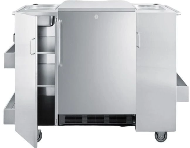 SUMMIT's CartOS brings luxury and convenience to the outdoors in a stainless steel serving cart. This 61" wide unit lets you create an upscale kitchen right in your own backyard, beginning with ample storage space. Keep items on three exterior shelves and inside magnetic locking doors fitted with elegant towel bar handles. The cart includes room for ice storage and a removable stainless steel countertop. Cart OS is completely constructed from 304 grade stainless steel to weather the elements in classic style. You can remove the center to install a SUMMIT refrigerator, freezer, or beer cooler for more storage options.